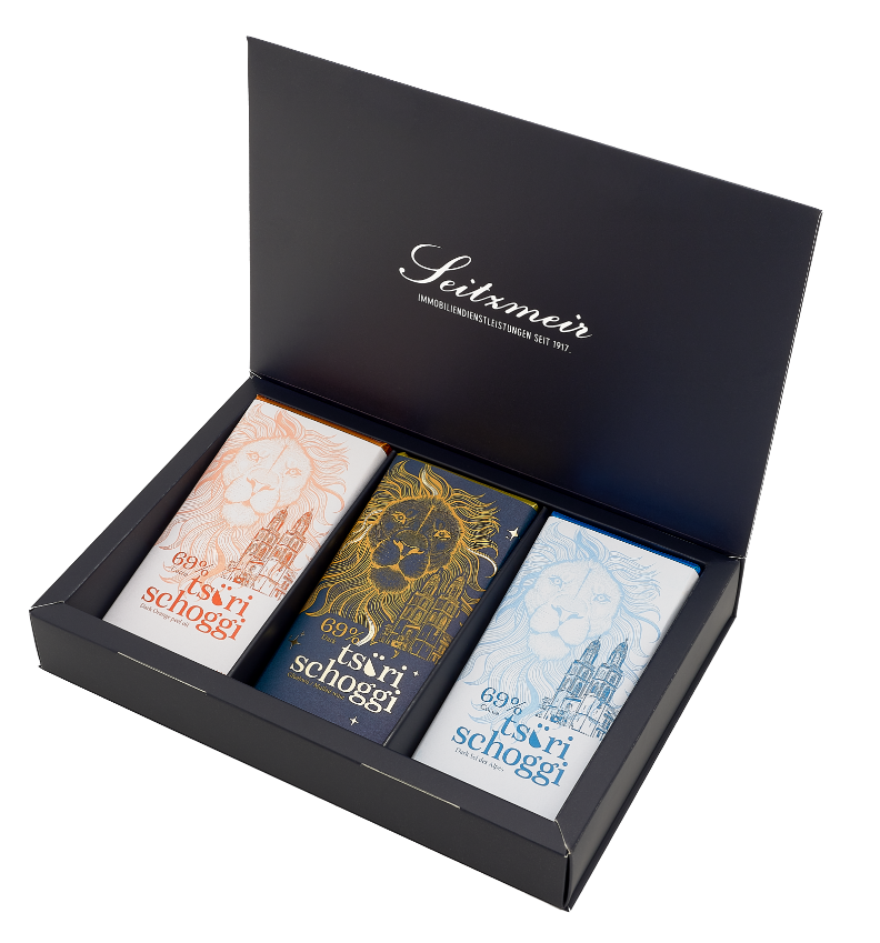 Verschenke drei bis neun Schokoladentafeln oder vier Riegel in einer personalisierten Geschenkbox.